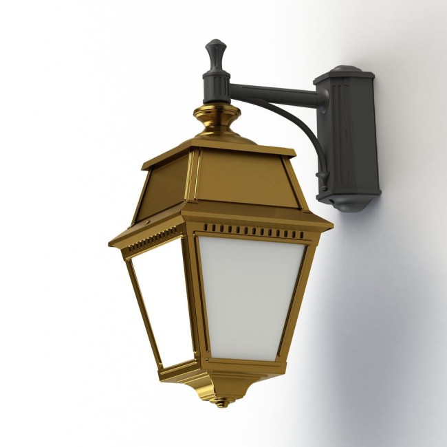 Applique descendante AVENUE 2, LED 13W 2700°K, IP44, classe 1, diffuseurs méthacrylate opale. Matière lanterne : laiton vernis teinté 070. Matière potence : aluminium, teinte RAL 9005 noir foncé 000