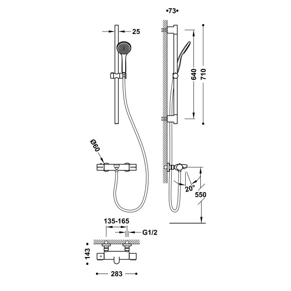 Kit robinet thermostatique mural pour baignoire et douche · Barre de douche : long. 640 mm. · Support coulissant et orientable pour douchette à main. · Douchette à main anticalcaire : Ø 100 mm. · Flexible métallique. Finition: Chromé. Gamme: Base Plus