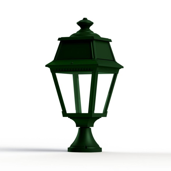 Borne AVENUE 2 en aluminium, LED 13W 2700°K, IP44, classe 1, diffuseurs verre clair. Teinte RAL 6009 Vert anglais 019. Garantie 25 ans anticorrosion sur l'aluminium