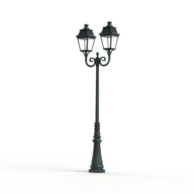 Lampadaire 2 têtes AVENUE 3 en aluminium, LED 35W 3000°K, IP44, classe 1, diffuseurs verre clair. Finition Patine vert de gris 008. Garantie 25 ans anticorrosion sur l'aluminium