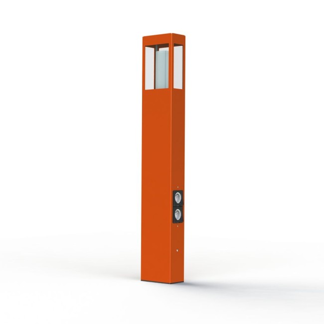 Borne BRICK² hauteur 1100mm avec 2 prises FR, en aluminium, E27, IP44, classe 2, vitrage verre clair, diffuseur satiné. Teinte RAL 2004 Orangé pur 014. Garantie 25 ans anticorrosion sur l'aluminium
