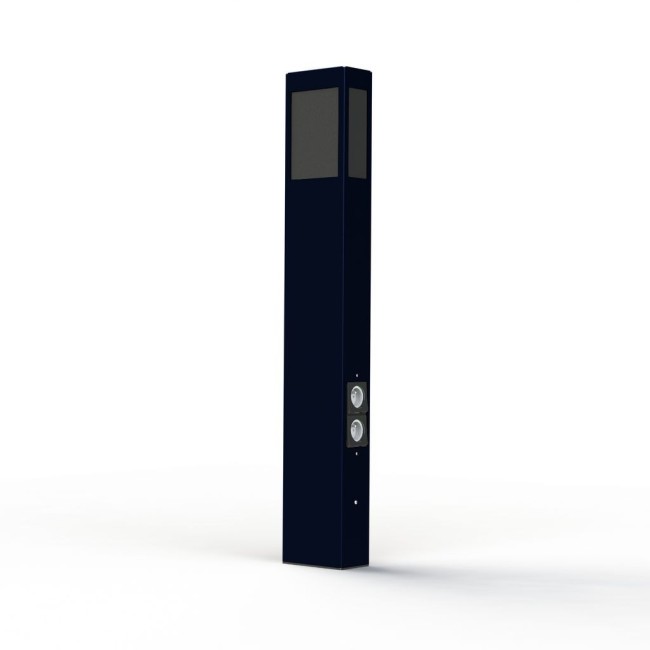 Borne BRICK² hauteur 1100mm avec 2 prises FR, en aluminium, E27, IP44, classe 2, vitrage PMMA noir. Teinte RAL 5011 Bleu acier 065. Garantie 25 ans anticorrosion sur l'aluminium