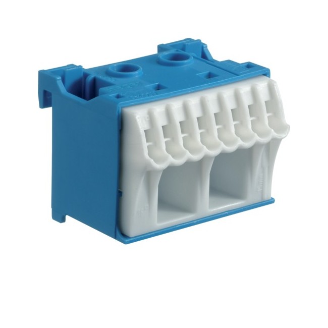 Bornier neutre sanvis 8x4mm2 + 2x25mm2, 63A. Les borniers sont équipés à la fois de bornes SansVis à enfichage direct pour des câbles de 1,5 à 4mm² et de bornes à cages pour le raccordement de câbles de toutes sections de 1,5 à 25mm².