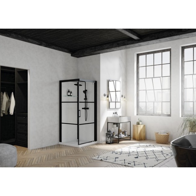 Cabine Brooklyn noir pivotante, 90x90 verre sérigraphié 2 bandes noires , mitigeur thermostatiquestatique