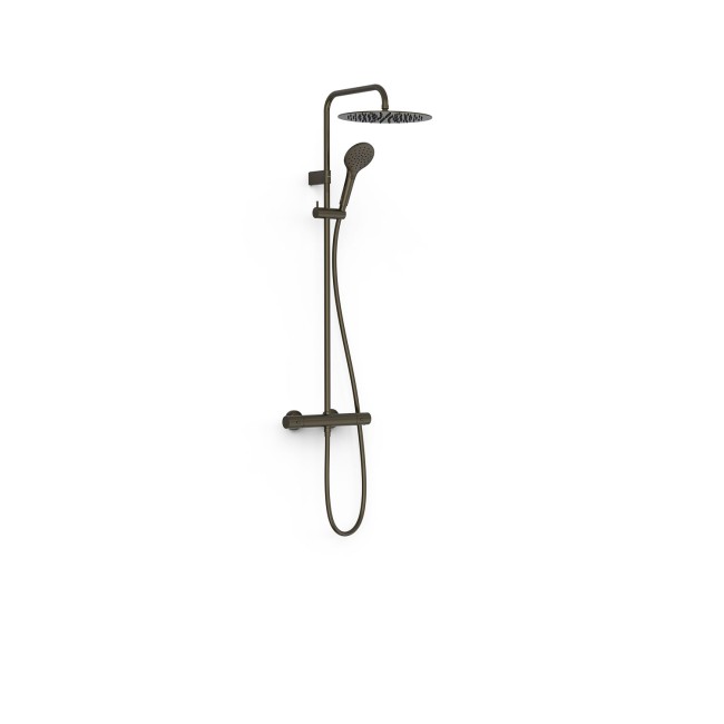 Ensemble de robinet thermostatique mural à 2 voies pour douche. · Avec inverseur intégré dans le régulateur de débit. · Volant rond. · Pommeau de douche orientable en acier inoxydable : Ø300 mm. · Support coulissant et orientable pour douchette à main. · Douchette à main anticalcaire: Ø110 mm. (3 types de jet). · Flexible satin.