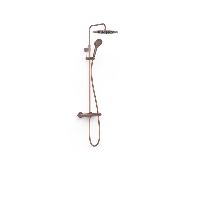 Ensemble de robinet thermostatique mural Over‑wall à 2 voies pour douche · Avec inverseur intégré dans le régulateur de débit. · Volant ovale. · Barre de douche télescopique. · Pommeau de douche orientable en acier inoxydable : Ø 300 mm. · Support coulissant et orientable pour douchette à main. · Douchette à main anticalcaire: Ø 110 mm. (3 fonctions). · Flexible satin.