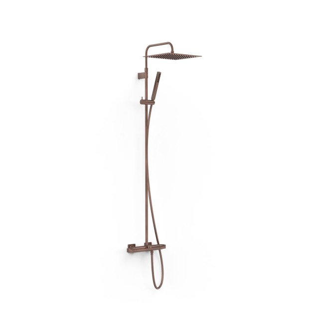 Ensemble de robinet thermostatique mural Over‑wall à 3 voies pour baignoire et douche · Inverseur intégré dans le régulateur de débit. · Volant carré-rond. · Barre de douche télescopique. · Pommeau de douche orientable en acier inoxydable : 300x300 mm. · Support coulissant et orientable pour douchette à main. · Douchette à main anticalcaire en laiton. · Flexible satin.