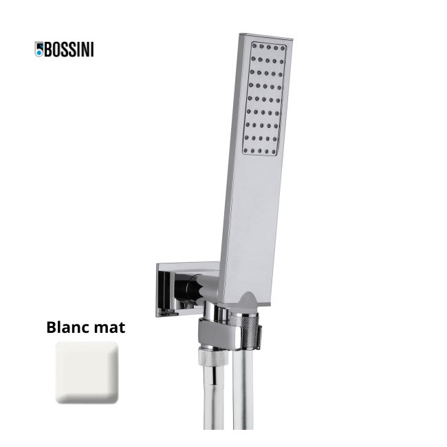 Ensemble encastré avec support orientable, douchette flat-one et flexible : Une finition d'exception pour une salle de bains design. Profondeur : 74mm. Largeur : 45,2mm. Épaisseur : 9,2mm. Support au mur : 43x64mm. Raccordement : 1/2"GAS. Flexible : 150cm. Anticalcaire : Easy-Clean, picots anticalcaire. Nombre de jet : 1. Finition : Noir mat. Garantie 2 ans. Bossini créer de la robinetterie fonctionnelle et design qui vous permettrons de donner une esthétique propre à votre salle de bain. Dans sa gamme Black & White, Bossini a voulu une esthétique moderne axé sur deux finitions mat pour un aspect design.