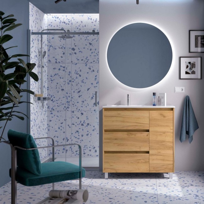 Ensemble NOJA II 900 3 tiroirs Chêne Africain (Meuble de salle de bain+plan vasque+miroir+applique) dimensions mm: largeur 900 x profondeur 450 À poser Réf. 118372 SALGAR