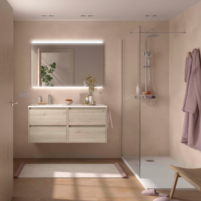 Ensemble NOJA II 1200 4 tiroirs Chêne Naturel (Meuble de salle de bain+plan vasque+miroir+applique) dimensions mm: largeur 1200 x profondeur 450 Suspendu Réf. 119711 SALGAR