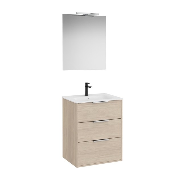 Optica pack 3 tiroirs (meuble, lavabo porcelaine, miroir, applique) 600 mm frêne clair