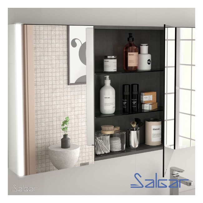 Armoire de salle de bain ALLIANCE 1200 3 portes miroir avec lumière LED : De quoi illuminer votre quotidien. Armoire ALLIANCE 1200 3 portes miroir double avec interrupteur et prise et lumière led supérieur/inferieur . Dimensions : 1222 x 650 x 150 mm . Finition extérieure sur le devant et les côtés : Miroir. Finition interne : Carbon TX (Anthracite-Tx). Couleur LED : Neutre (lumière du jour) . Degré de protection : IP44 . Chants du meuble : en PVC et colle PUR. Puissance en Watts : 21,5W. Garantie 5 ans. Alliez style et fonctionnalité avec l'armoire de toilette Alliance : éclairage latéral, miroirs haut de gamme, étagères réglables et prise intégrée pour une salle de bain lumineuse et parfaitement organisée.