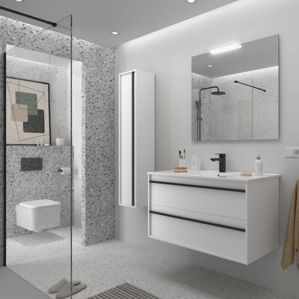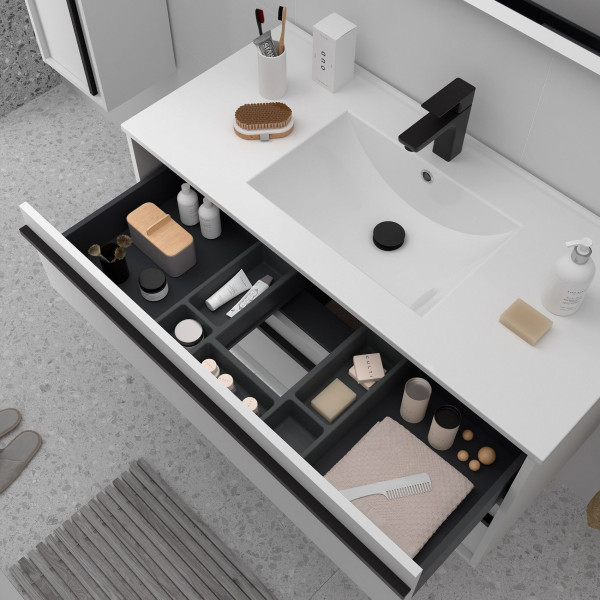 Les meubles de salle de bain ATTILA se distinguent par leur poignée noire caractéristique pour les finitions en bois et pour la finition mate du meuble. De plus, ils comprennent un organiseur de tiroir et sont équipés de guides HETTICH avec fermeture amortie.