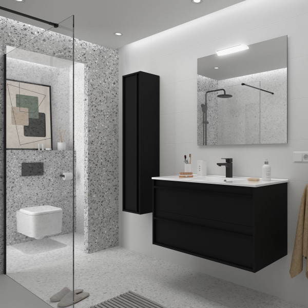 Les meubles de salle de bain ATTILA se distinguent par leur poignée noire caractéristique pour les finitions en bois et pour la finition mate du meuble. De plus, ils comprennent un organiseur de tiroir et sont équipés de guides HETTICH avec fermeture amortie.
