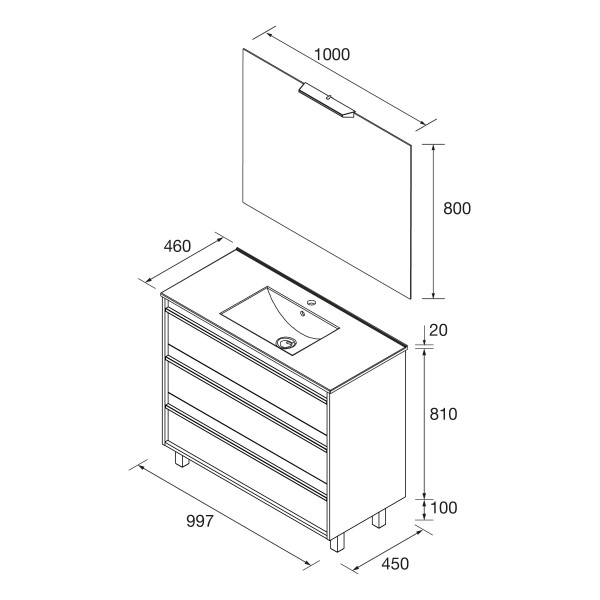 Le meuble de salle de bain Attila est disponible en 600, 800, 1000 ou 1200 mm avec une profondeur de 45 mm.