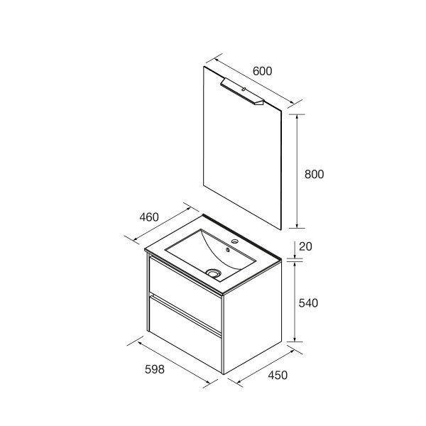 Le meuble de salle de bain Noja est disponible en 600, 700, 800, 900, 1000, 1200 ou 1400 mm avec une profondeur de 45 mm.
