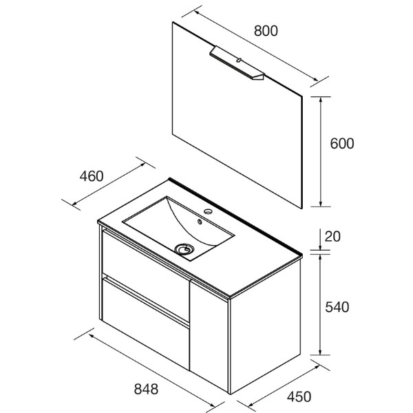 Caractéristiques du meuble de salle de bain Noja 850 :