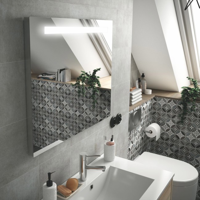 Le miroir SUNSET se caractérise par son éclairage led et son système antibuée. Une led (remplaçable) est intégrée sur la partie supérieure du miroir en forme de rectangle, d’une puissance comprise entre 6 et 12 W en fonction de la dimension du miroir. Il est fabriqué en verre poli biseauté de 5 mm. Il dispose d’un système antibuée basse consommation et d’une led avec indice IP44 indiquant sa résistance aux éclaboussures habituelles de la salle de bains. Il dispose d’un traitement antirouille pour éviter tout problème de rouille et d’un branchement direct au secteur. Il ne peut être posé que dans le sens horizontal. Dimensions (mm) : 900 x 600