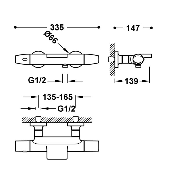 TRES Noir Bronze. Robinet thermostatique mural Over‑wall pour baignoire et douche Sans accessoires. Inverseur intégré dans le régulateur de débit. Volant ovale.