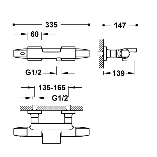 TRES Acier. Robinet thermostatique mural Over‑wall pour baignoire et douche Sans accessoires. Inverseur intégré dans le régulateur de débit. Volant carré-rond.