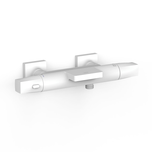 TRES WHITEMAT (blanc mat). Robinet thermostatique mural Over‑wall pour baignoire et douche Sans accessoires. Inverseur intégré dans le régulateur de débit. Volant carré-rond.