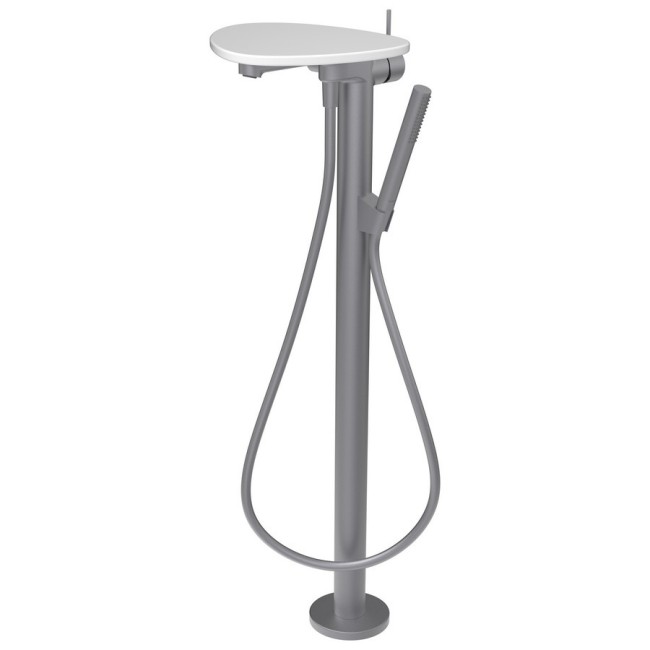 Ada mitigeur de bain sur colonne, tablette non percée, bec 203 mm, avec flexible et douchette pvd inox/blanc mat