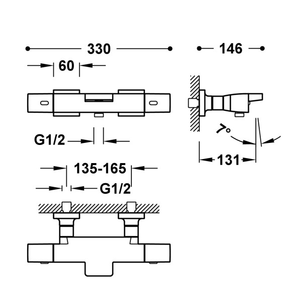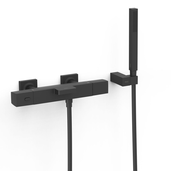Robinet thermostatique mural pour baignoire et douche. Douchette à main anticalcaire en laiton. Support orientable pour douchette à main. Flexible satin. Volant carré.