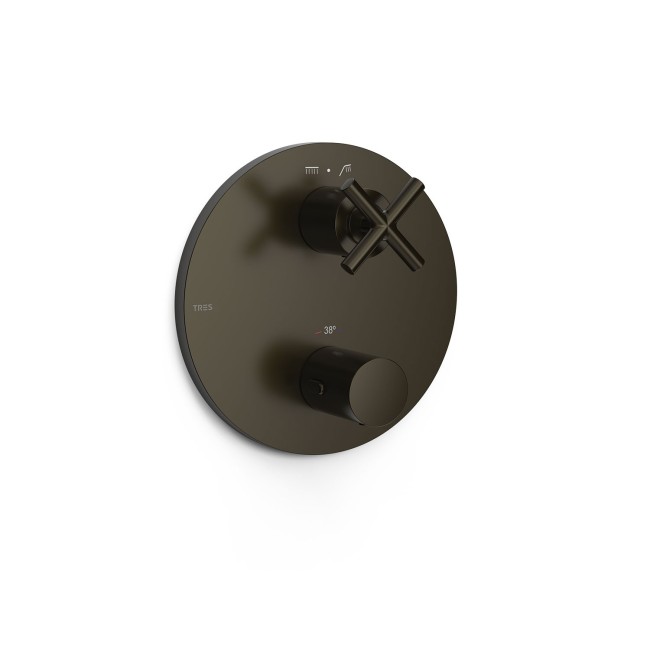 TRES Noir Bronze. Pièce apparente pour boîtier encastré Therm‑box 2 voies Pièce apparente seulement. Volant croisillon. Comprend la plaque de finition, la commande et la poignée de distribution. Compléter avec le boîtier encastré Therm‑box réf. : 20785001.