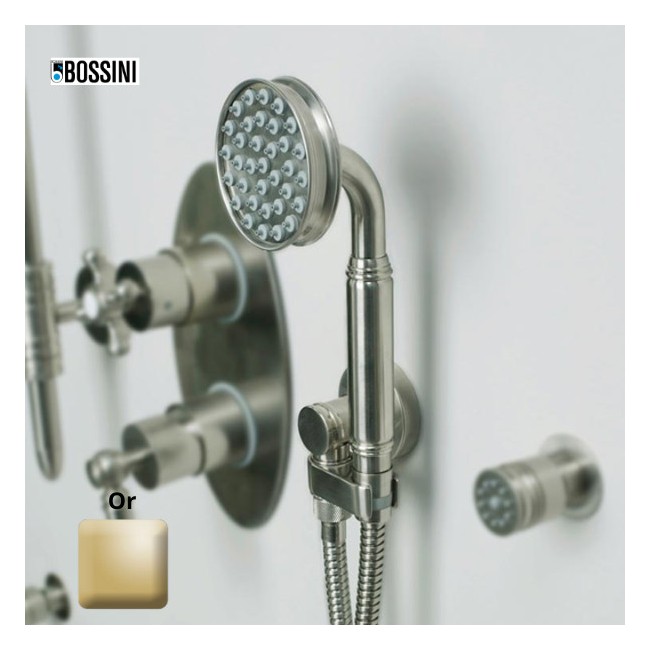 Kit de douche avec douchette Liberty, support et flexible : Tout en un pour votre confort dans la douche ! Ensemble de douche Liberty-Gom, sortie murale avec support orientable et flexible laiton double agrafage cm 150. Douchette : B00193 - Douchette Liberty-Gom Ø 81 monojet. Flexible : A03045 - Flexible laiton 125cm double agrafage 1/2” x 1/2” FF . Support de douche : C17000 - Support orientable en laiton. 1 jet : pluie . Finition : Nickel satiné . Garantie 2 ans . Bossini est une marque italienne qui sait lier tradition et modernité. Dans sa gamme Liberty Line, Bossini a intégré toute la technologie moderne dans un robinet d'aspect rétro. Liberty Line vous propose 4 finitions qui vous permettrons d'intégrer cette robinetterie dans vos intérieurs.