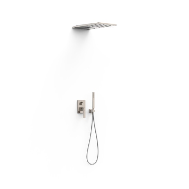 Kit mitigeur encastré à 3 voies Rapid‑box pour douche · Structure encastrée incluse. · Distributeur céramique à 3 voies. · Pommeau de douche mural en acier inoxydable avec 2 types de jet (pluie/cascade). 280 x 550 mm. IMPORTANT : Prévoir un système de vidage > 50 l/min. · Support pour douchette à main avec arrivée d’eau murale. · Douchette à main anticalcaire en laiton. · Flexible satin. Finition: Acier. Gamme: Slim