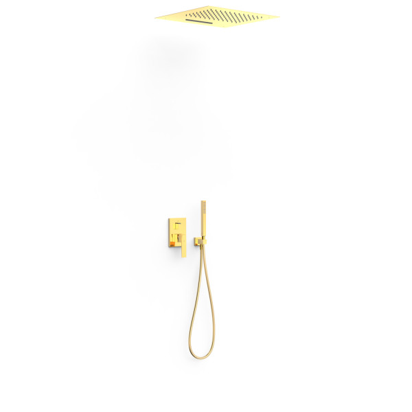 TRES Or 24K. Kit mitigeur encastré à 3 voies Rapid‑box pour douche · Structure encastrée incluse. · Distributeur céramique à 3 voies. · Pommeau de douche encastré au plafond en acier inoxydable avec 2 types de jet (pluie/cascade). 500x500 mm. IMPORTANT : Prévoir un système de vidage > 50 l/min. · Support pour douchette à main avec arrivée d’eau murale. · Douchette à main anticalcaire en laiton. · Flexible satin.