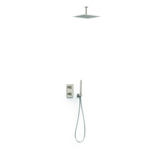 Kit robinet thermostatique encastré Therm‑box à 2 voies pour douche ⌦ Corps encastré non inclus (réf. 20785001). · Volant carré-rond avec contrôle de la température et volant de distribution. · Bras au plafond avec pommeau de douche orientable en acier inoxydable : 300x300 mm. · Support pour douchette à main avec arrivée d’eau murale. · Douchette à main anticalcaire en laiton. · Flexible satin.
