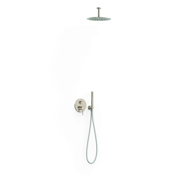 Kit mitigeur encastré à 2 voies Rapid‑box pour douche ⌦ Corps encastré non inclus (réf. 20828110). · Distributeur à 2 voies. · Bras au plafond avec pommeau de douche orientable en acier inoxydable : Ø 300 mm. · Support pour douchette à main avec arrivée d’eau murale. · Douchette à main anticalcaire en laiton. · Flexible satin.