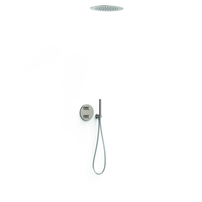 Kit robinet thermostatique encastré Therm‑box à 2 voies pour douche ⌦ Corps encastré non inclus (réf. 20785001). · Volant rond avec contrôle de la température et volant de distribution. · Pommeau de douche encastré au plafond en acier inoxydable : Ø 405 mm. · Support pour douchette à main avec arrivée d’eau murale. · Douchette à main anticalcaire en laiton. · Flexible satin.