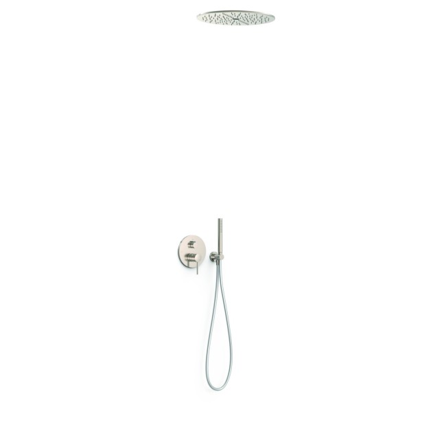 Kit mitigeur encastré à 3 voies Rapid‑box pour douche ⌦ Corps encastré non inclus (réf. 20827310). · Distributeur à 3 voies. · Pommeau de douche encastré au plafond en acier inoxydable avec 2 fonctions (pluie/free flow). Ø 405 mm. · Support pour douchette à main avec arrivée d’eau murale. · Douchette à main anticalcaire en laiton. · Flexible satin.