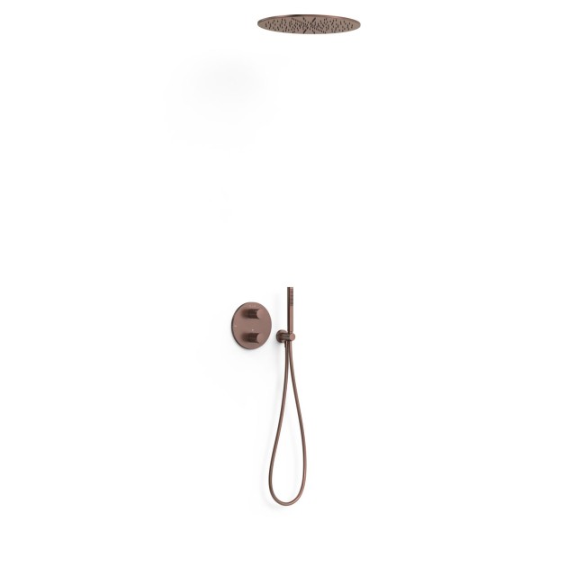 Kit robinet thermostatique encastré Therm‑box à 2 voies pour douche ⌦ Corps encastré non inclus (réf. 20785001). · Volant rond avec contrôle de la température et volant de distribution. · Pommeau de douche encastré au plafond en acier inoxydable : Ø 405 mm. · Support pour douchette à main avec arrivée d’eau murale. · Douchette à main anticalcaire en laiton. · Flexible satin.
