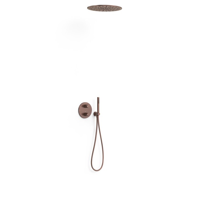 Kit robinet thermostatique encastré Therm‑box à 2 voies pour douche ⌦ Corps encastré non inclus (réf. 20785001). · Volant ovale avec contrôle de la température et volant de distribution. · Pommeau de douche encastré au plafond en acier inoxydable : Ø 405 mm. · Support pour douchette à main avec arrivée d’eau murale. · Douchette à main anticalcaire en laiton. · Flexible satin.