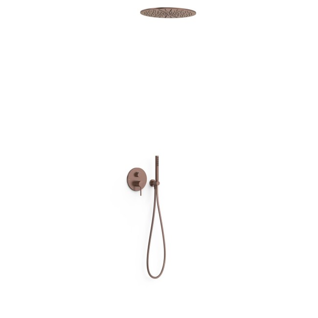 Kit mitigeur encastré à 2 voies Rapid‑box pour douche ⌦ Corps encastré non inclus (réf. 20828110). · Distributeur à 2 voies. · Pommeau de douche encastré au plafond en acier inoxydable : Ø 405 mm. · Support pour douchette à main avec arrivée d’eau murale. · Douchette à main anticalcaire en laiton. · Flexible satin.