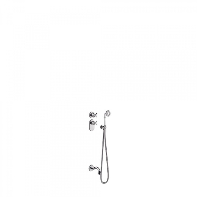 Kit thermostatique baignoire encastré avec fermeture et réglage du débit (2 voies). · Corps encastré thermostatique inclus · Bec baignoire. · Coude mural (242.732.01). · Douchette anticalcaire Ø 78 mm. (299.631.09). · Flexible double agrafage. - TRES 24235201