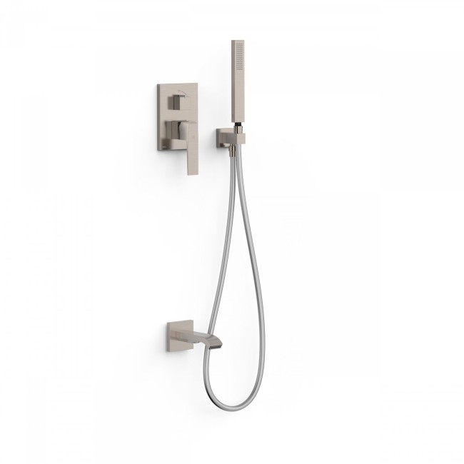 Kit de bain-douche encastré Rapid-Box avec fermeture et réglage du débit. · Corps encastré inclus · Bec baignoire. · Coude mural. · Douchette anticalcaire. · Flexible satin.