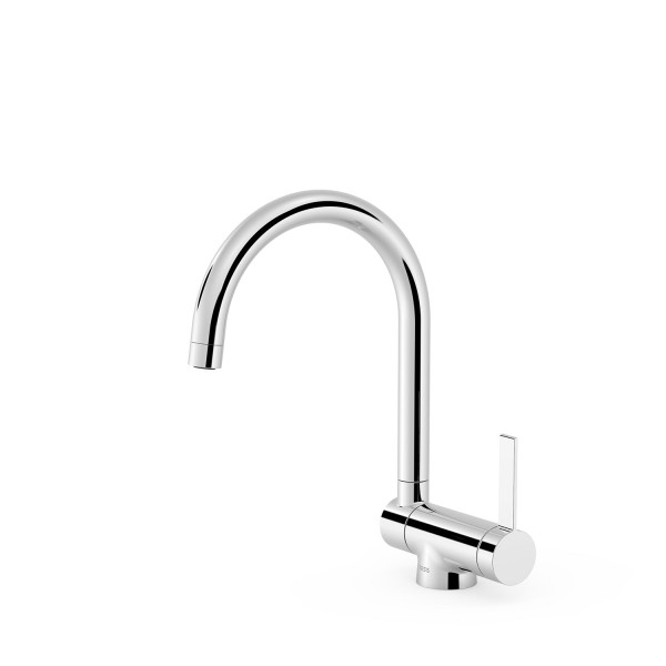 Mitigeur à bec rabattable pour cuisine · Avec des flexibles d'alimentation en eau G3/8. · Hauteur totale lorsque le bec est rabattu : 6 cm. Finition: Chromé.