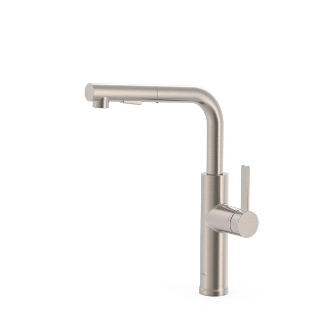 TRES Acier. Mitigeur à bec amovible et 2 types de jet pour la cuisine Avec flexible rétractable en polyamide tressé. Avec flexibles d’alimentation G3/8.
