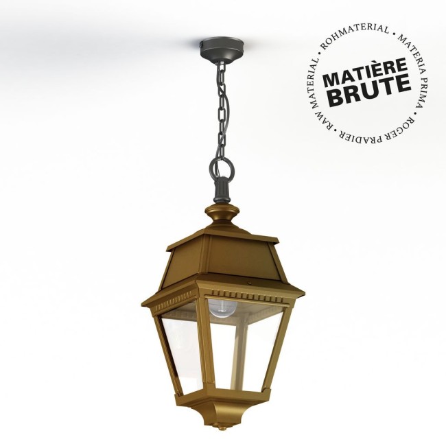 Suspension chaîne AVENUE 2, E27, IP44, classe 1, diffuseur verre clair. Matière lanterne: Laiton brut 072 - Matière chaîne: Aluminium: Teinte RAL 9005 Noir foncé 000
