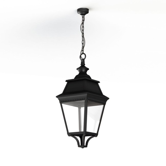 Suspension chaîne AVENUE 3 en aluminium, E27, IP44, classe 1, diffuseurs verre clair. Teinte RAL 9005 Noir foncé 000. Garantie 25 ans anticorrosion sur l'aluminium