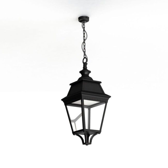 Suspension chaîne AVENUE 3 en aluminium, LED 35W 3000°K, IP44, classe 1, diffuseur verre clair. Teinte RAL 9005 Noir foncé 000. Garantie 25 ans anticorrosion sur l'aluminium