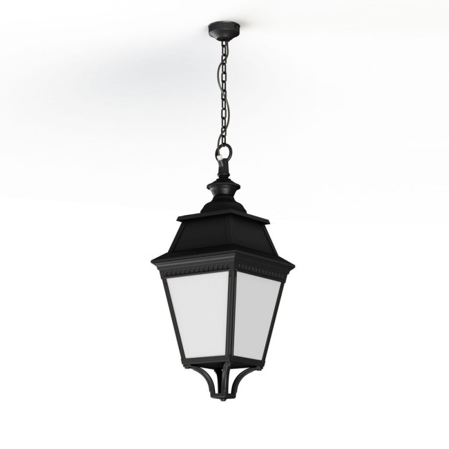 Suspension chaîne AVENUE 3 en aluminium, LED 35W 2700°K, IP44, classe 1, diffuseur méthacrylate opale. Teinte RAL 9005 Noir foncé 000. Garantie 25 ans anticorrosion sur l'aluminium