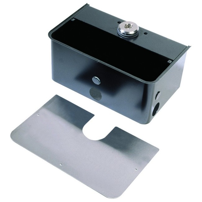 Caisson à sceller. Equipé de sorties pour évacuation des eaux et de zone permettant le passage des tubes flexibles pour la liaison avec la centrale hydraulique. Couvercle Inox.