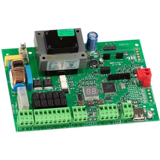 Platine de Gestion pour opérateurs de 800W max compatible Simply Connect. Compatible carte radio RP & XF FDS. Equipée d'un afficheur et bornier 2Easy. Alimentation accessoires 24Vcc/500mAh. Sortie feu clignotant 230Vac et Serrure.
