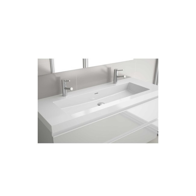 Vasque intégrée à charge minérale blanche de forme rectangulaire, centrée et avec deux robinets.